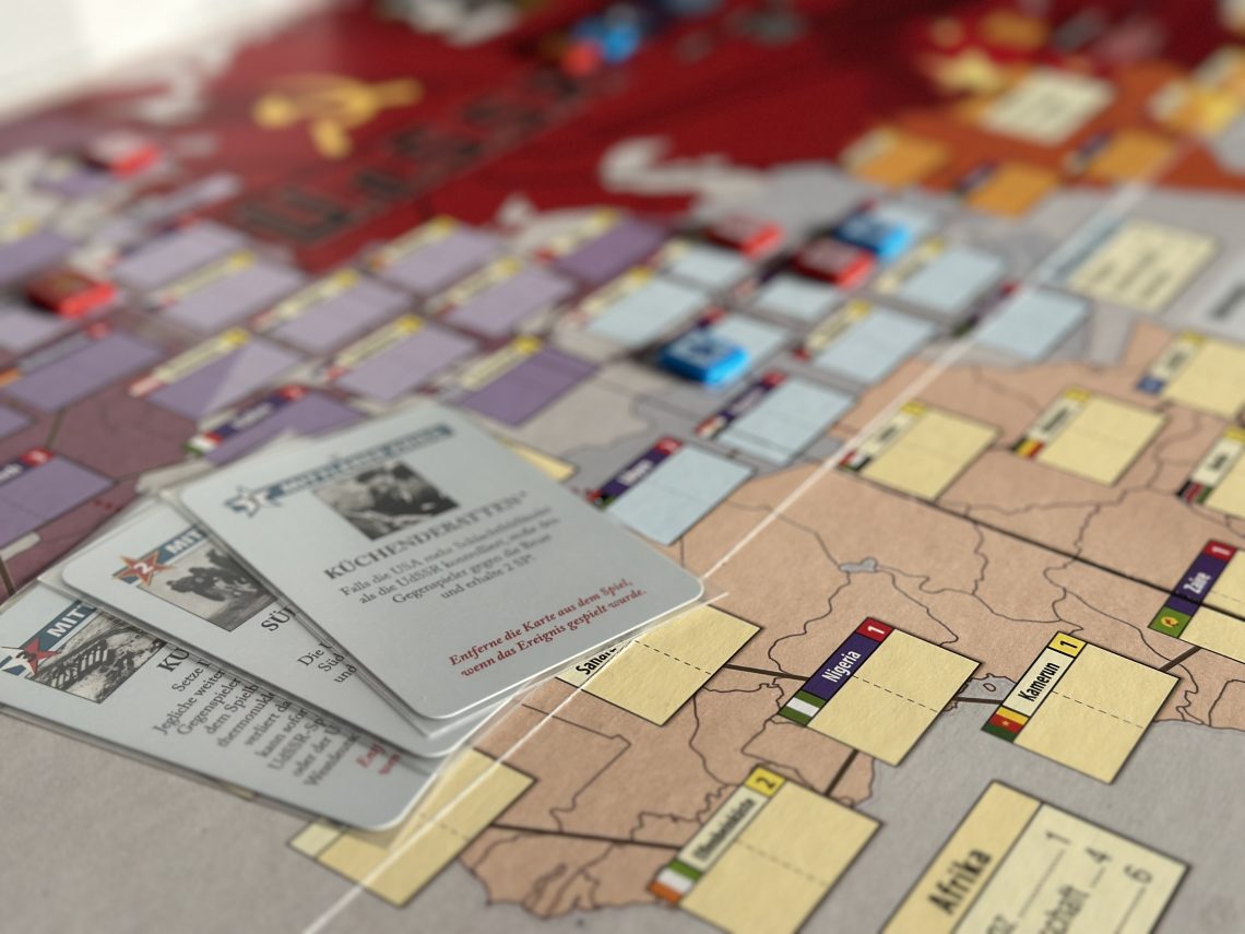 Es dauerte rund ein Jahr, bis ich es dann erneut gekauft hatte, weil ich nicht glauben wollte, dass sich unser Ersteindruck bestätigt. Zu unserem Glück schlug es dann ein wie eine Bombe. Inzwischen haben wir hier viele Partien gespielt und es ist wohl das emotionalste Zwei-Personen-Spiel für uns. Bei keinem anderen Spiel kochen die Emotionen manchmal so hoch wie hier. Mit etwas Übung lässt es sich auch super „fluffig“ runterspielen und ist damit trotz der Länge und Komplexität für uns zu einem regelmäßigen Event geworden. Zwischenzeitlich hatten wir auch ähnliche Titel wie Europe in Turmoil oder auch ein Labyrinth gespielt, aber keines ist in Kombination aus Komplexität, Spiellänge und Zugänglichkeit bei uns so beliebt wie Gleichgewicht des Schreckens (im Original: Twilight Struggle).