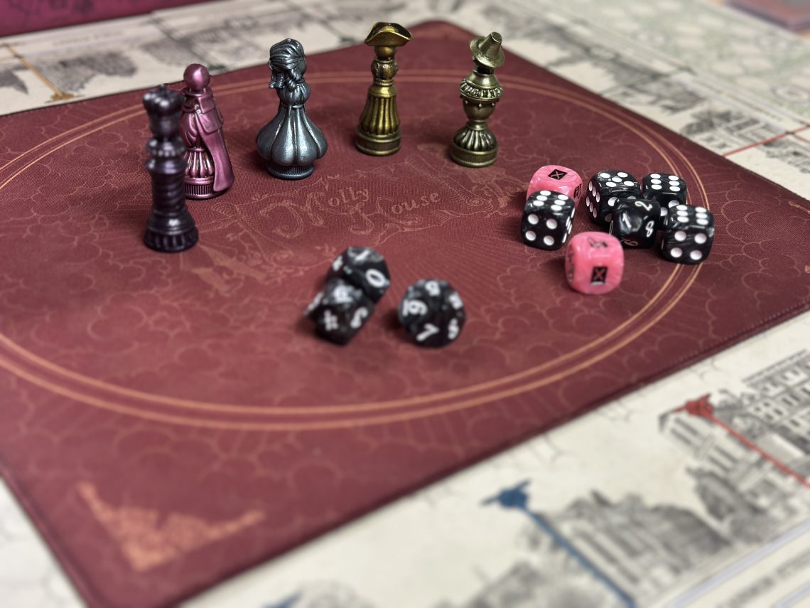 Bei Molly House (Cole Wehrle, Jo Kelly – Wehrlegig Games) spielen wir sogenannte Mollies im frühen 18. Jahrhundert in London und wir sind Teil einer queeren Community. Als Teil dieser Community möchten wir im besten Fall Partys veranstalten, um „Joy“ zu erspielen. Sprich – je besser die Party, desto mehr Joy kann erspielt werden.