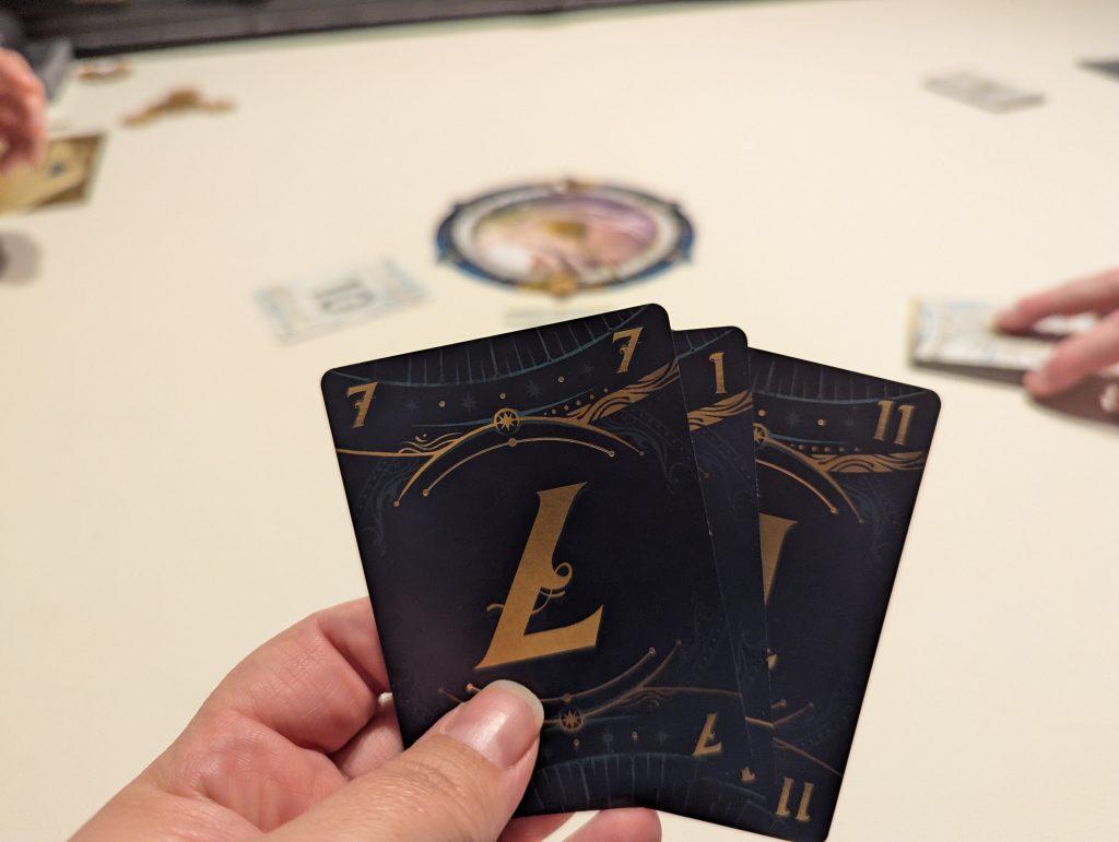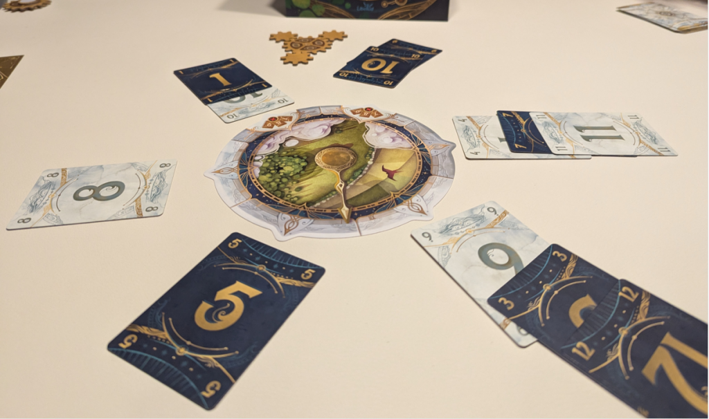 Take Time ist ein Deduktionsspiel, bei dem man eine Uhr mit sechs Slots hat, an die man in aufsteigender Reihenfolge verdeckt Zahlen anlegen muss (es zählt jeweils die Summe aller anliegenden Kartenwerte). Der Clou: Jeder hat eine bestimmte Anzahl an Karten und man darf während der ganzen Runde nicht miteinander sprechen. Das heißt, nur ich selbst weiß, welche Karte ich wo angelegt habe und ich muss aus wenig bekannten Informationen deduzieren, welche anderen Karten wohl im Spiel sind – und wo diese liegen.